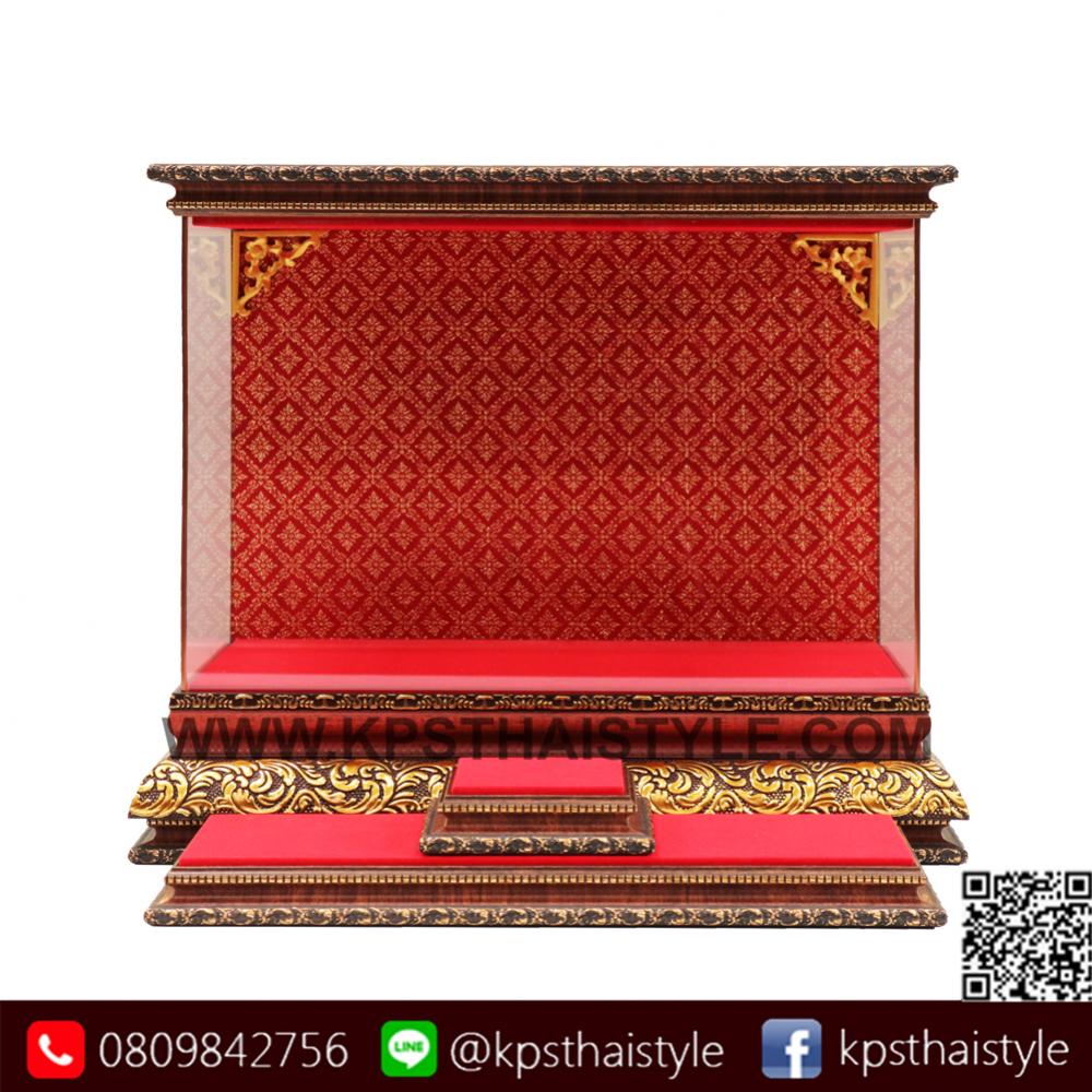 ตู้ครอบพระฉากหลังผ้าไทย ฉลุไม้มุมทอง ฐานเสริมด้านใน